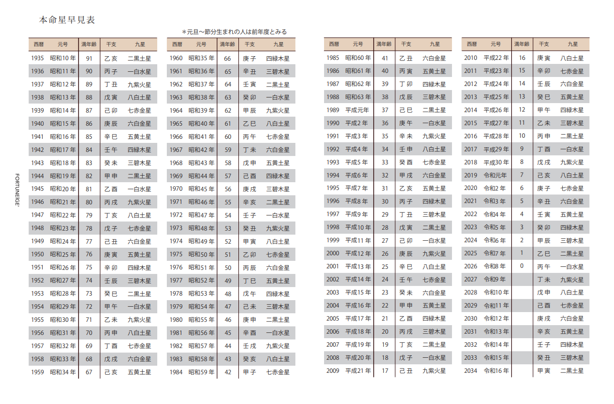 本命性早見表(ほんめいせいはやみひょう)でご自分の生まれ年がどの九星本命星なのかを調べてください。